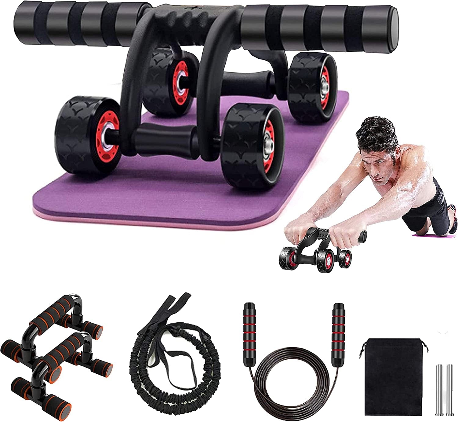 - 💪【5 in 1 Ab 4 Roller Kit】: The ab wheel roller kit includes 1 4-wheel AB roller, 2 resistance bands, 1 adjustable jump rope, 1 knee pad and 1 pair of push-ups. This combo caters to every need of home fitness, whether your goal is a quick workout or a cardio workout, our ab workout equipment is ideal for your home gym!